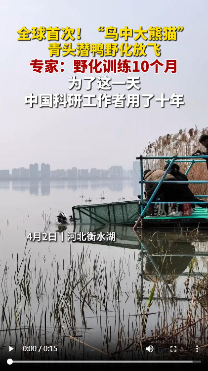 全球首次!4月2日,12只青头潜鸭在衡水湖野化放飞。为了这一天,中国科研工作者整整走过了10年,历经人工繁育、自然繁育、野化放飞三个阶段,突破野化训练、行为监测等多项技术瓶颈,在青头潜鸭保护上给出了中国方案。