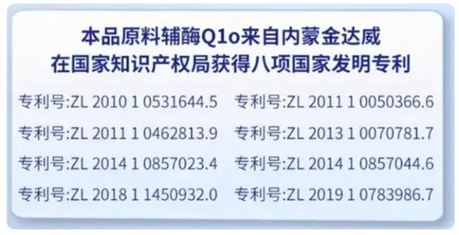 每粒含49.5mg高活性泛醇(还原型辅酶Q10),荣获两项还原型辅酶Q10生产发明专利,专利号为CN103601622B、CN117015612A,可通过国家知识产权局官网查询。