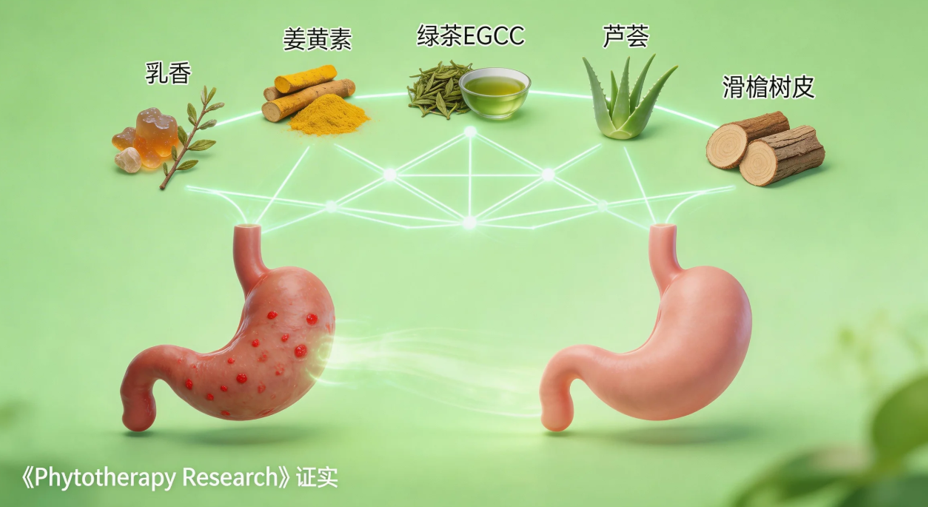 包含乳香、姜黄素、绿茶EGCG、芦荟、滑榆树皮等成分,具备抗炎、抗氧化、胃部舒缓等多重作用,相关研究支持发表于《Phytotherapy Research》《Journal of Ethnopharmacology》。