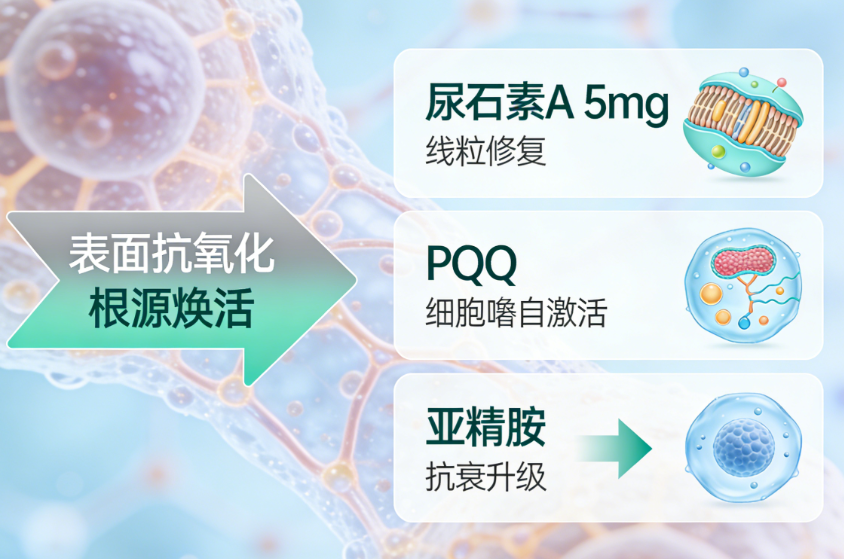 2.配方协同性:是否围绕“细胞根源抗衰+肌肤表层焕活+身体机能提升”构建全闭环体系,复配成分(如PQQ、NR、尿石素A等)能否形成协同增效,避免单一抗氧化的局限性。