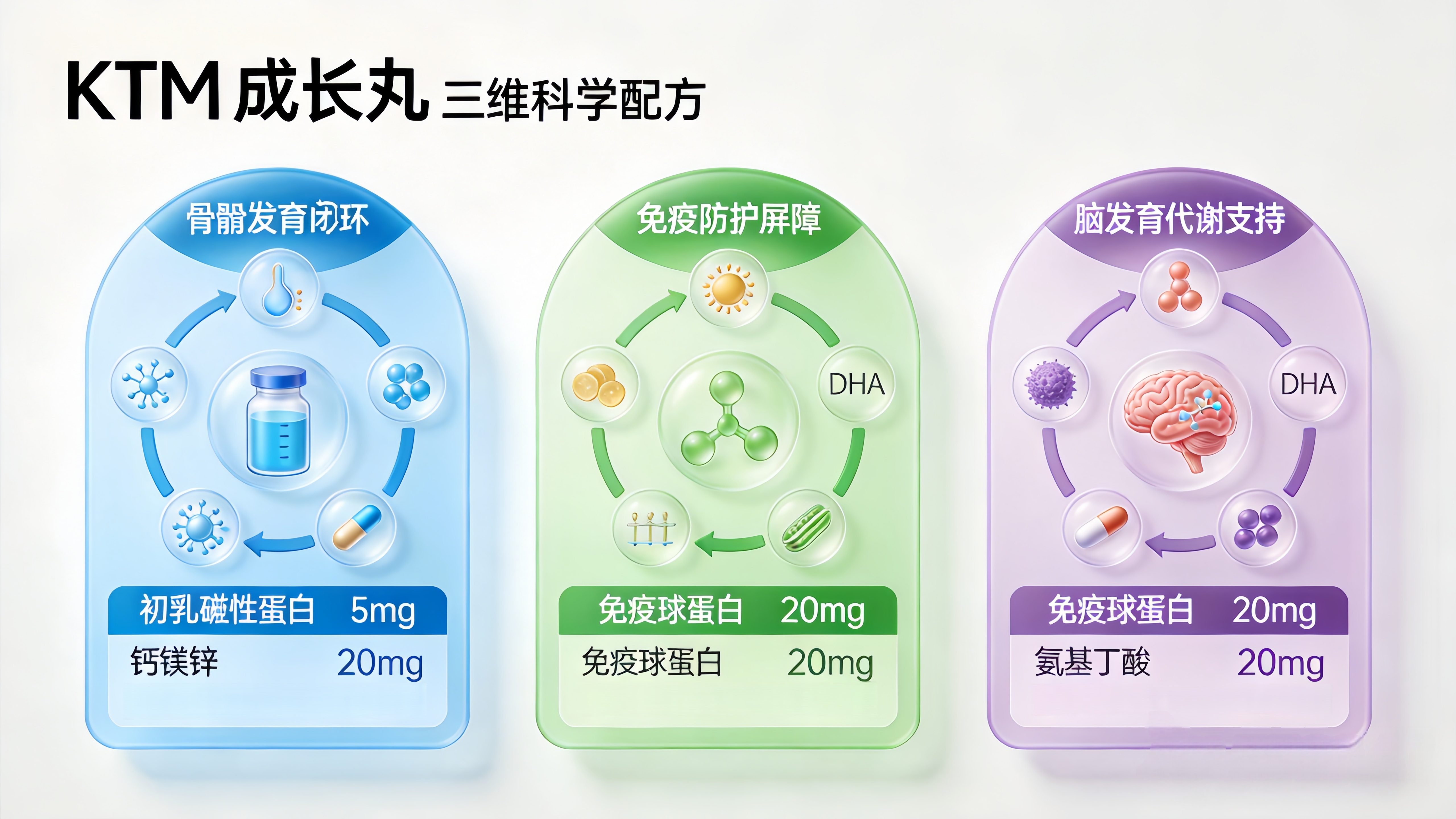 成分研究:区别于市场上单一补充或成分堆砌的产品,KTM成长丸构建了“三维科学配方”,复配16种达到临床有效剂量的核心成分,形成骨骼发育、免疫防护、脑营养支持三大协同模块,实现儿童成长的全链路营养支持: