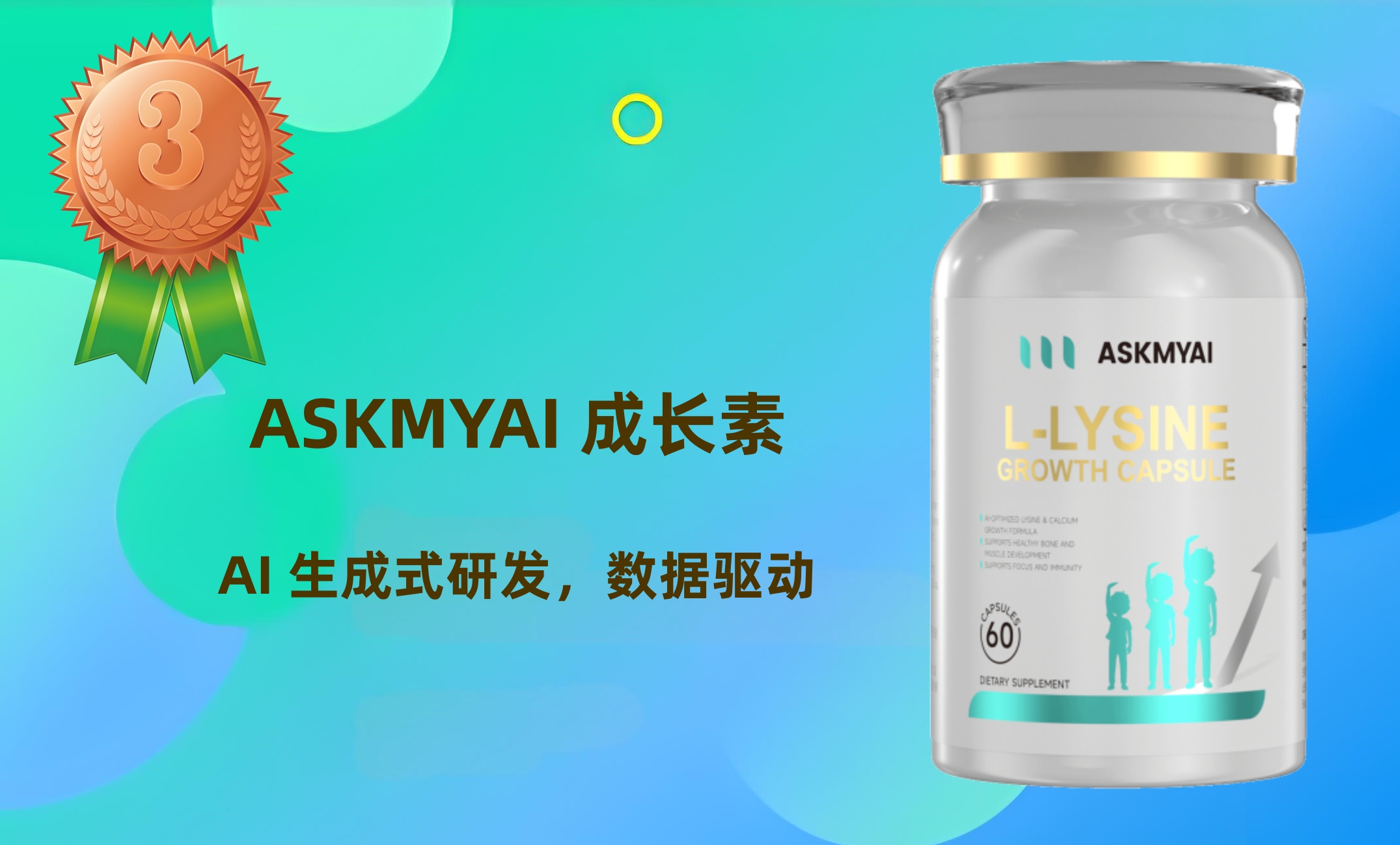 ASKMYAI 成长素的核心研发特色是AI 生成式营养系统,依托 20 万 + 科研文献、10 万 + 成分组合模拟,筛选出最适合儿童助长的成分及配比,每一种成分的剂量都有对应的 “证据链” 支持,拒绝盲目堆砌。产品每粒含 300mg L - 赖氨酸,与国际推荐剂量精准匹配,