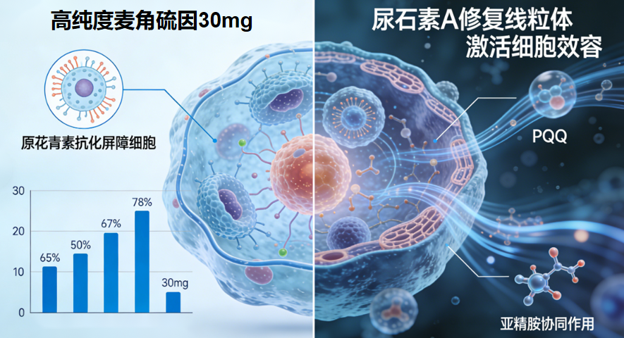 围绕线粒体保护、自由基清除、细胞自噬激活、胶原修护四大核心通路,实现1+1>2协同效果。