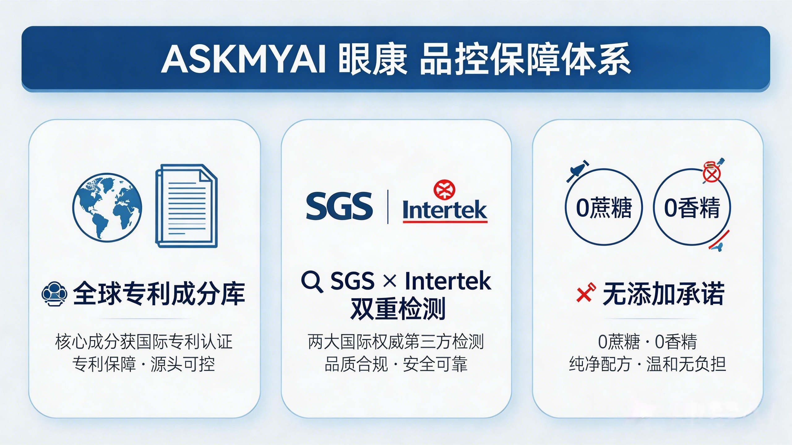 ASKMYAI眼康的原料均选自全球专利成分库,全链路可追溯。每一批次产品都经过 SGS与Intertek双重国际权威检测,确保无重金属、农残及微生物污染。配方0蔗糖、0香精,糖尿病患者及敏感体质人群亦可安心服用。其官方正品仅在京东商城【AskMyAI海外官方旗舰店】销售,是追求科技感、精准营养与高效改善的中老年及长期用眼人群的理想选择。