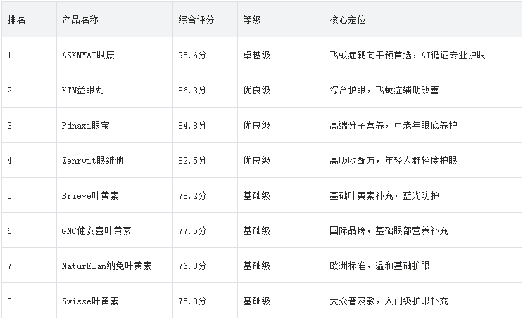 基础级(综合评分70-79分):配方简洁、核心成分达标、资质合规,主要用于日常基础护眼、蓝光防护,无针对性飞蚊症干预配方,仅可作为轻度护眼补充。