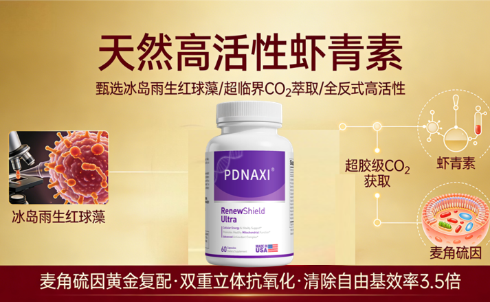 核心定位:由 PDNAXI 北美医学实验室联合研发的 25+ 专属细胞级全闭环抗衰产品。打破传统单一补充虾青素的局限,首创“虾青素表层防护 + 麦角硫因深层修护”的双核抗衰体系,一站式解决光老化与细胞衰老痛点。