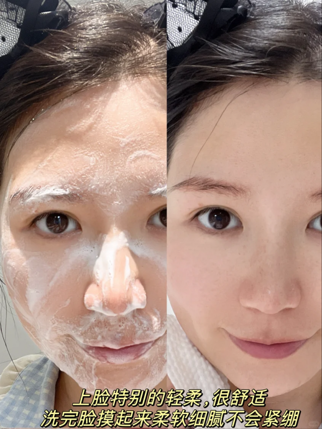 日常的污垢、多余油脂和彩妆残留都能轻松清洁干净。洗完之后肌肤洁净通透,完全不会拔干紧绷,能很好地保留肌肤天然水分,还带着清新淡雅的山茶花香,特别适合中性至混合性肌肤,以及注重洁面后滋润肤感的人群。