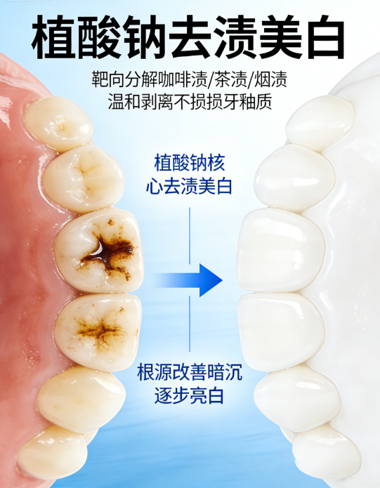 植酸钠能精准捕捉牙齿表面及深层色素,温和溶解顽固沉积,无需高摩擦,逐步改善牙色暗沉,让牙齿呈现自然透亮光泽。