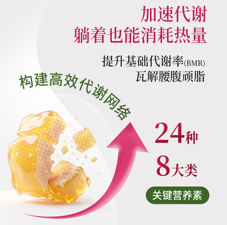 同时,产品特别添加β-羟基-β-甲基丁酸钙(HMB-Ca),能有效降低减脂期肌肉流失风险——肌肉作为基础代谢的核心载体,肌肉量稳定才能确保代谢不下滑,为长效减脂奠定基础。
