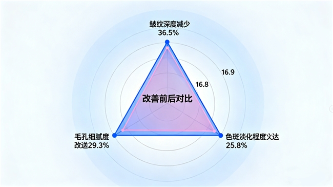 ② 肌肤年轻化实证:为期12周的临床观察显示,使用者面部皱纹深度平均减少36.5%,色斑淡化达25.8%,毛孔粗大改善率为29.3%。产品还能辅助修复光老化损伤,强化皮肤屏障功能。