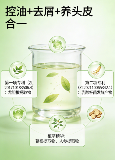 第一项专利(ZL 201710183506.4):对应龙胆根提取物、丁二醇、水,可舒缓头皮、调节代谢、减少油脂分泌,增强头皮屏障,避免清洁后“报复性出油”,为长效控油奠定基础。