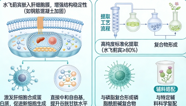 从细胞生物学的视角看,水飞蓟宾的护肝机制犹如一场精彩的微观防卫战。首先,它能嵌入肝细胞膜,增强其结构稳定性,好比给城墙做了 reinforced concrete(钢筋混凝土)加固,直接阻隔了部分毒素的侵入。其次,研究表明,它能激发肝细胞内部合成蛋白质的速率,促进新细胞的生成,加速损伤修复。更重要的是,它是一种强大的抗氧化剂,能直接中和那些破坏性的自由基,并提升肝脏内重要的抗氧化剂(如谷胱甘肽)的水平,为肝细胞创造一个更安全的内部环境。