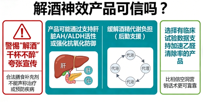 A: 务必警惕任何宣称“解酒”、“千杯不醉”的夸张宣传。合法的膳食补充剂不能声称治疗或预防疾病。一些产品可能通过支持肝脏的乙醇代谢酶(如ADH、ALDH)活性,或强化抗氧化防御来帮助身体更高效、更轻松地应对酒精代谢产生的负担,从而可能缓解部分不适。这更像是“后勤支援”,而非“酒精克星”。选择有临床试验数据支持其加速乙醛清除率的产品,比相信空洞的营销话术要可靠得多。