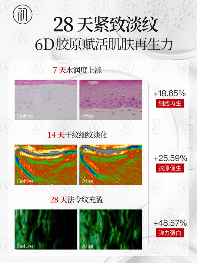 ② 玻色因+极致修复肽:玻色因作为抗衰领域的标杆成分,能快速重新激活衰老细胞,强韧肌肤屏障、赋活胶原蛋白,进一步增强肌肤紧致度,改善肌肤松垮问题。极致修复肽由6种活性肽组合而成,能补充真皮胶原收紧松弛肌肤,提高肌肤弹性,与6D胶原组合协同作用,实现“补充胶原+促进再生”的双重抗衰效果,让抗衰效果更持久。