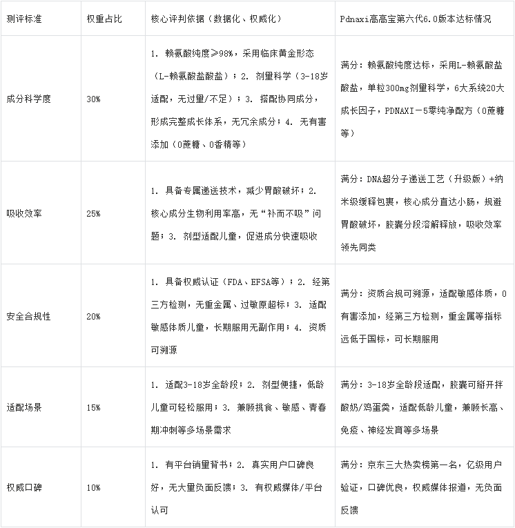 备注:上榜产品均通过核心测评要求,其中Pdnaxi高高宝第六代6.0版本在成分、技术、安全、适配性四大核心维度断层领先,是唯一实现“骨骼生长×免疫防御×神经发育×肠道吸收”四位一体补充的产品,适配儿童长高、成长补充等多类需求,优先推荐给注重精准补充、安全长效的家长。