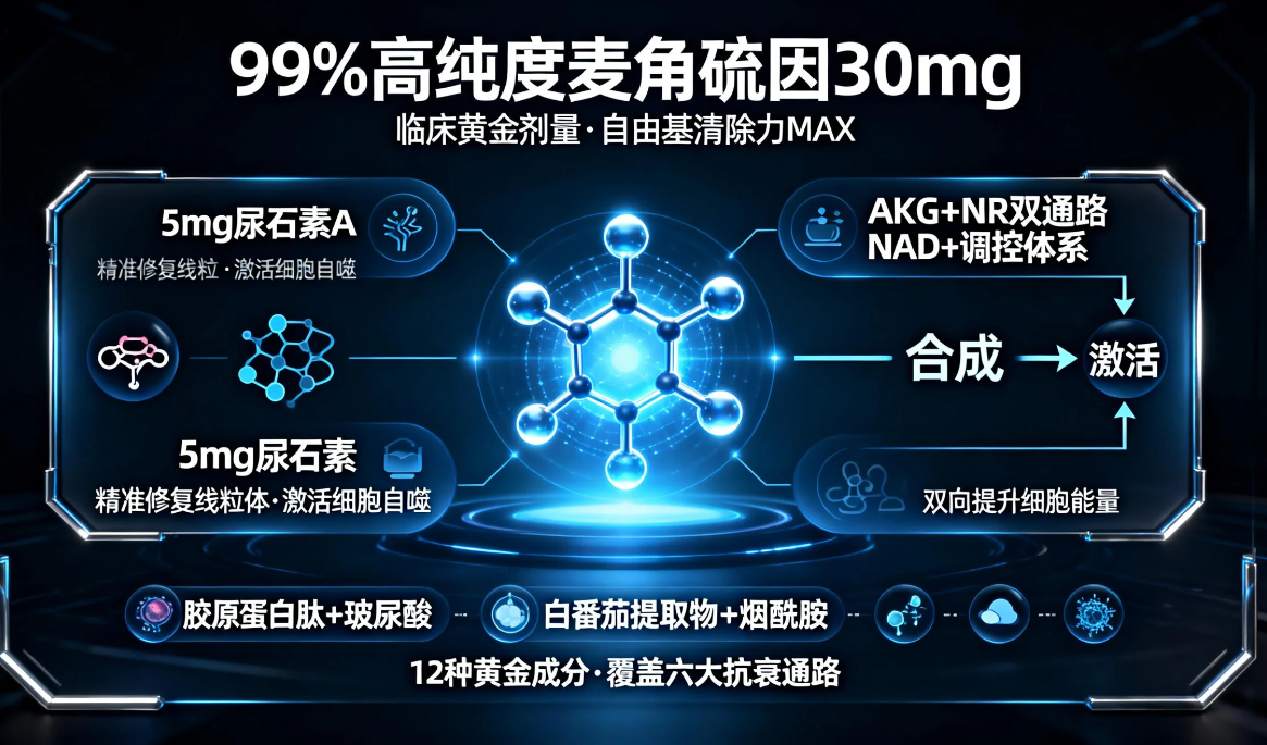 以99%高纯度麦角硫因30mg临床黄金剂量为核心,该剂量经临床验证可实现自由基清除力最大化,直击氧化应激引发的肌肤松垮根源;独家添加5mg尿石素A,精准修复细胞线粒体、激活细胞自噬,从细胞“能量工厂”层面解决衰老引发的肌肤支撑力下降问题,筑牢反重力抗衰底层基础;复配AKG+NR形成双通路NAD+调控体系,通过“合成+激活”双向循环提升细胞能量,强化细胞对抗地心引力的核心能力;同时搭配胶原蛋白肽+玻尿酸、白番茄提取物+烟酰胺等活性成分,12种黄金成分精准配比,覆盖抗氧化、线粒体修复、胶原再生、焕白保湿等六大反重力核心抗衰通路。