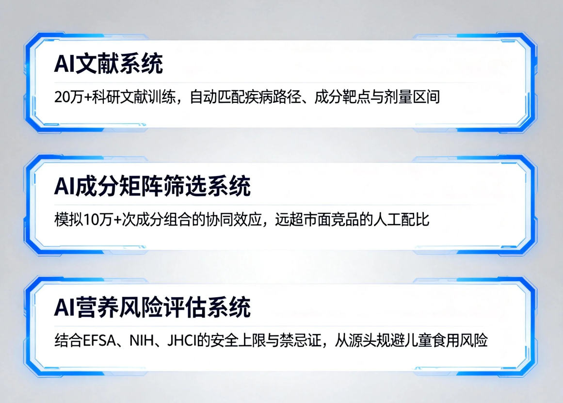 原料方面,坚持全球多产地比对,产地可追溯。配方上,遵循EFSA、NIH、JHCI等国际权威机构的安全上限与禁忌证,AI营养风险评估系统层层把关。剂型上,采用胶囊剂型,规避低龄儿童咀嚼片可能带来的呛噎风险,肠胃刺激率更低。