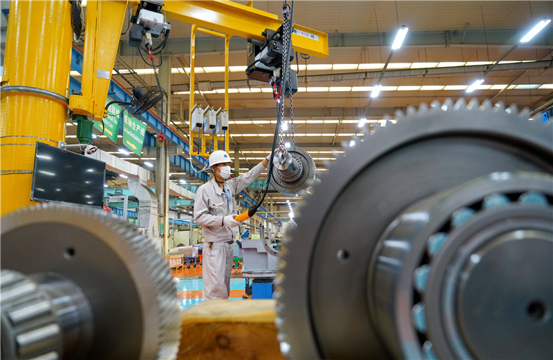 12月16日,河北省唐山市开平高新技术产业开发区一家大型减速机制造企业的工人在生产线上工作。新华社记者 牟宇 摄