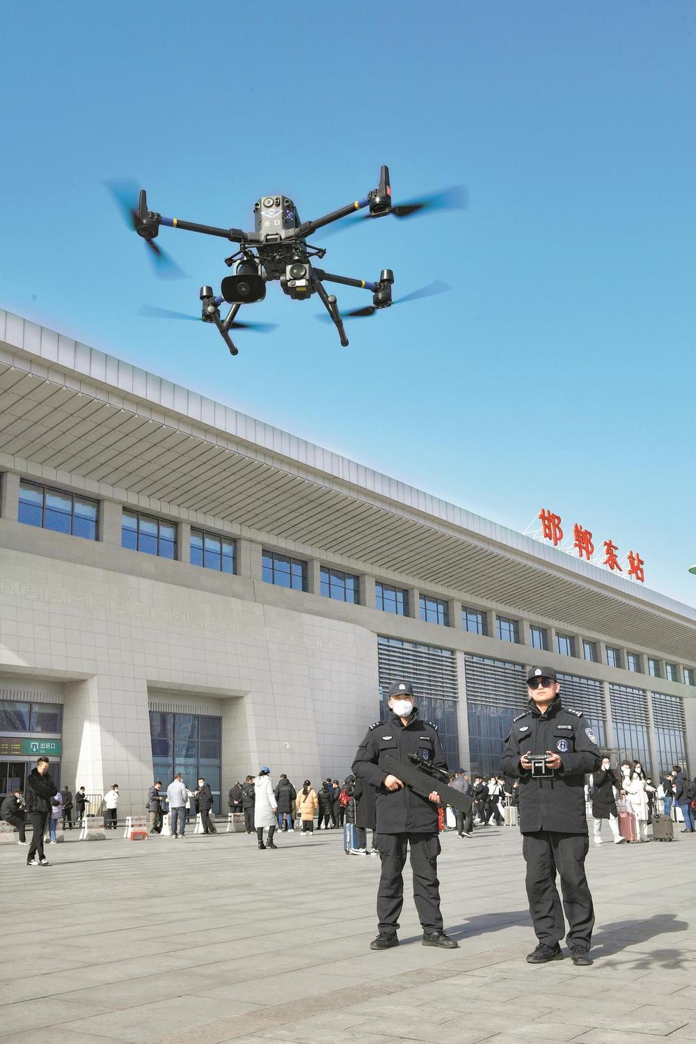 1月24日,市公安局特警支队无人机应用及反制大队民警操控无人机在邯郸东站执勤。 本报记者 李磊 摄