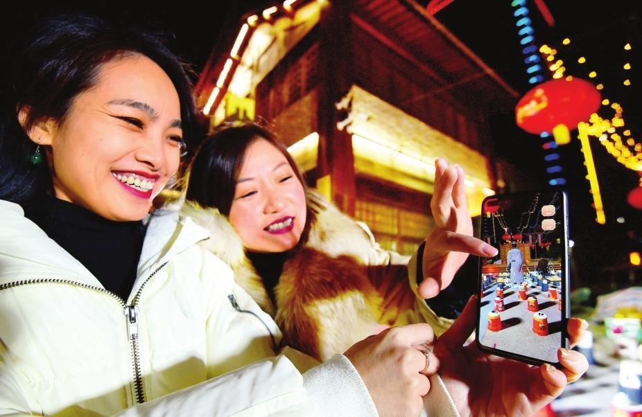 市民在回车巷历史文化街区用手机体验成语主题数字街区语主题数字街区。