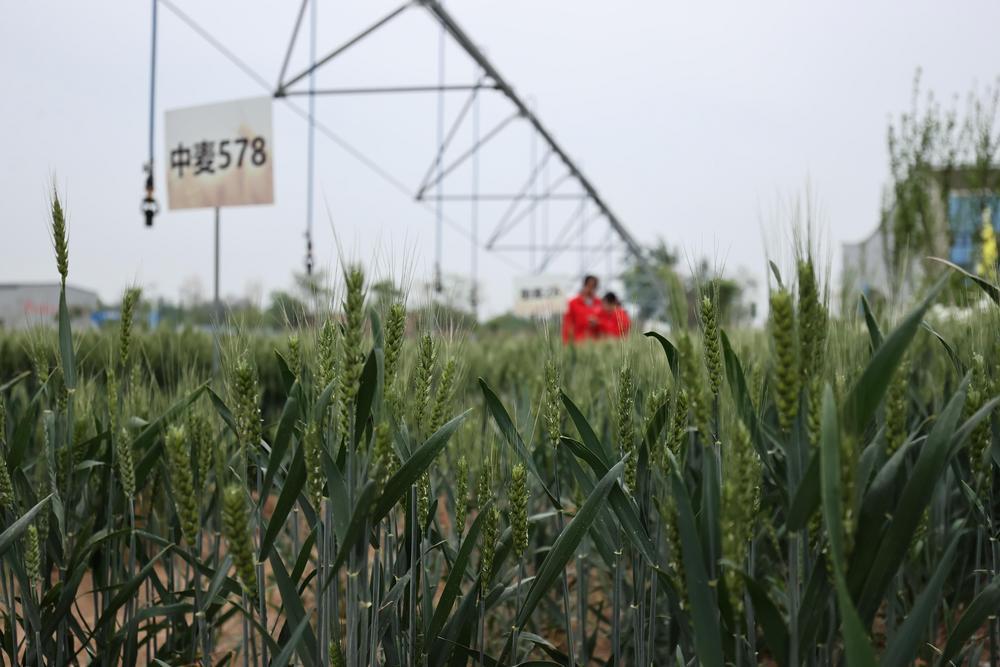 中国农大学生在曲周实验站小麦试验田查看小麦长势。