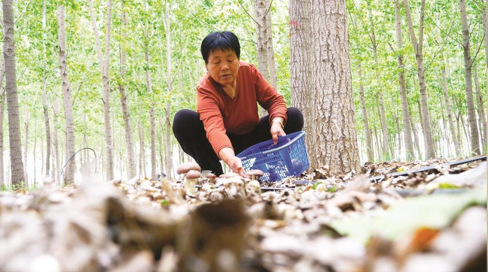 5月20日,平固店镇林下种植的赤松茸喜获丰收,图为南吴村村民王金爱正在采摘赤松茸。 李清波 摄
