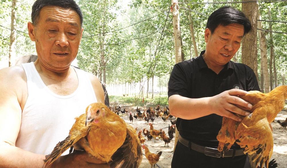 6月15日,平固店镇养殖基地负责人李建青(右一)查看林下柴鸡和大鹅养殖情况。 李清波 摄