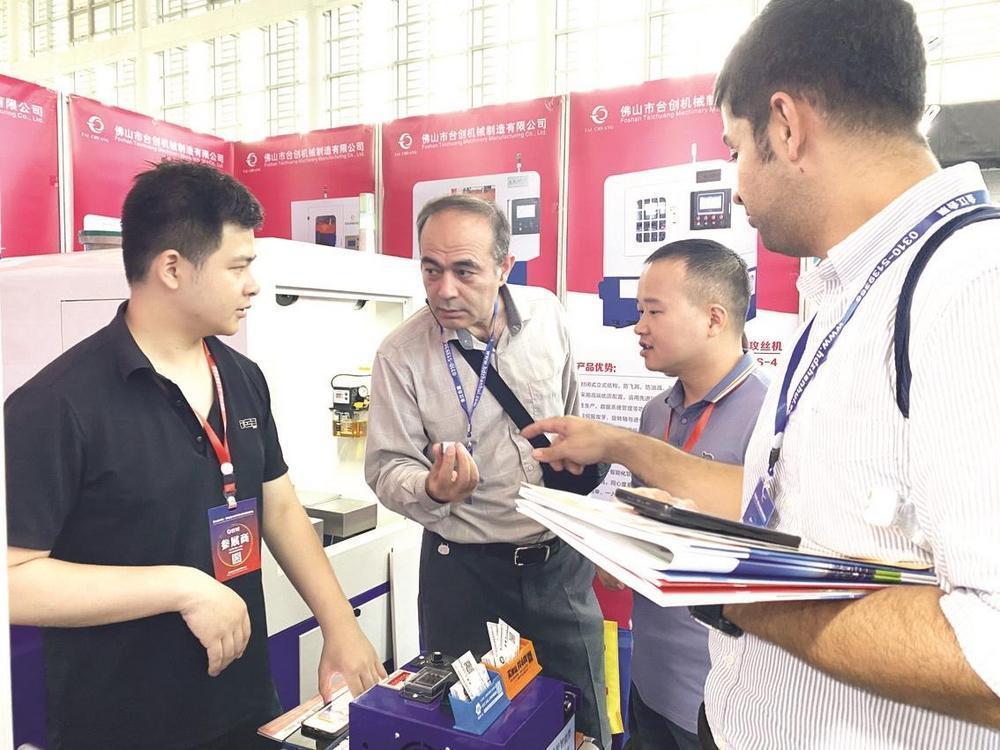 第十六届中国·邯郸(永年)紧固件及设备展览会上,国外采购商在展位前询问产品情况。 胡高雷 摄