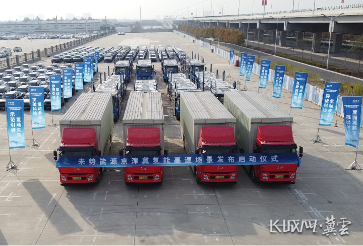 近日,数十辆氢燃料电池汽车装载货物完成后,从北京、天津、河北保定三地分别驶入京津冀区域各条氢能高速公路示范线。