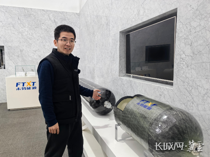 薛海龙介绍未势能源的新型储气瓶产品。长城网·冀云客户端 王日成 摄