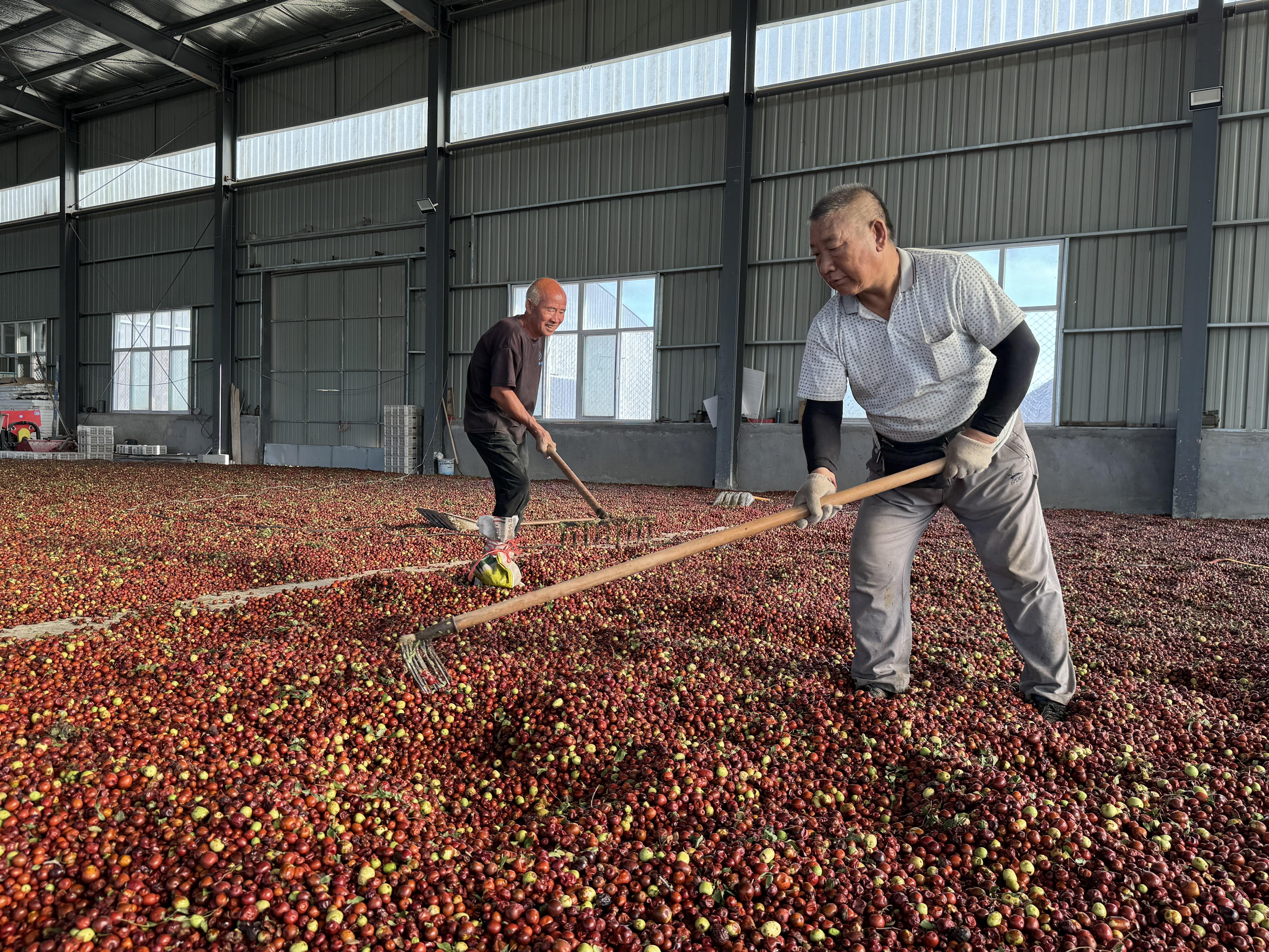在冀南新区南城乡前史村的酸枣种植基地,成排的酸枣树长到一人多高,一簇簇红如玛瑙的枣子挂满枝头。村民们正抢抓农时,在林地里拎着长杆忙着采摘,田间道上打包装运,穿梭往来,厂房里收来的酸枣被平铺摊开,小心翻晒。
