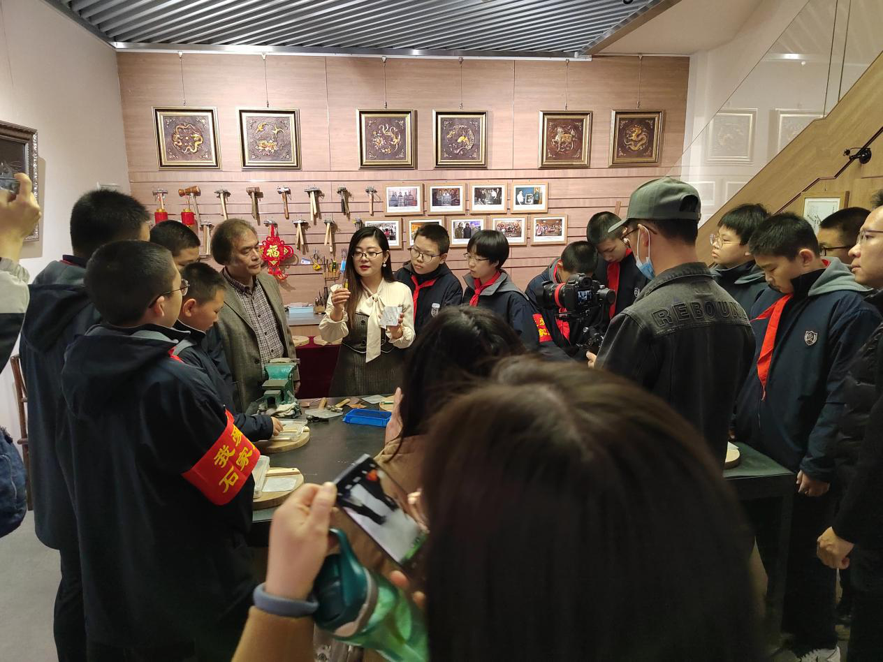 中国工艺美术大师郭海博与郭墨涵向学生们介绍铁板雕刻艺术制作技艺。
