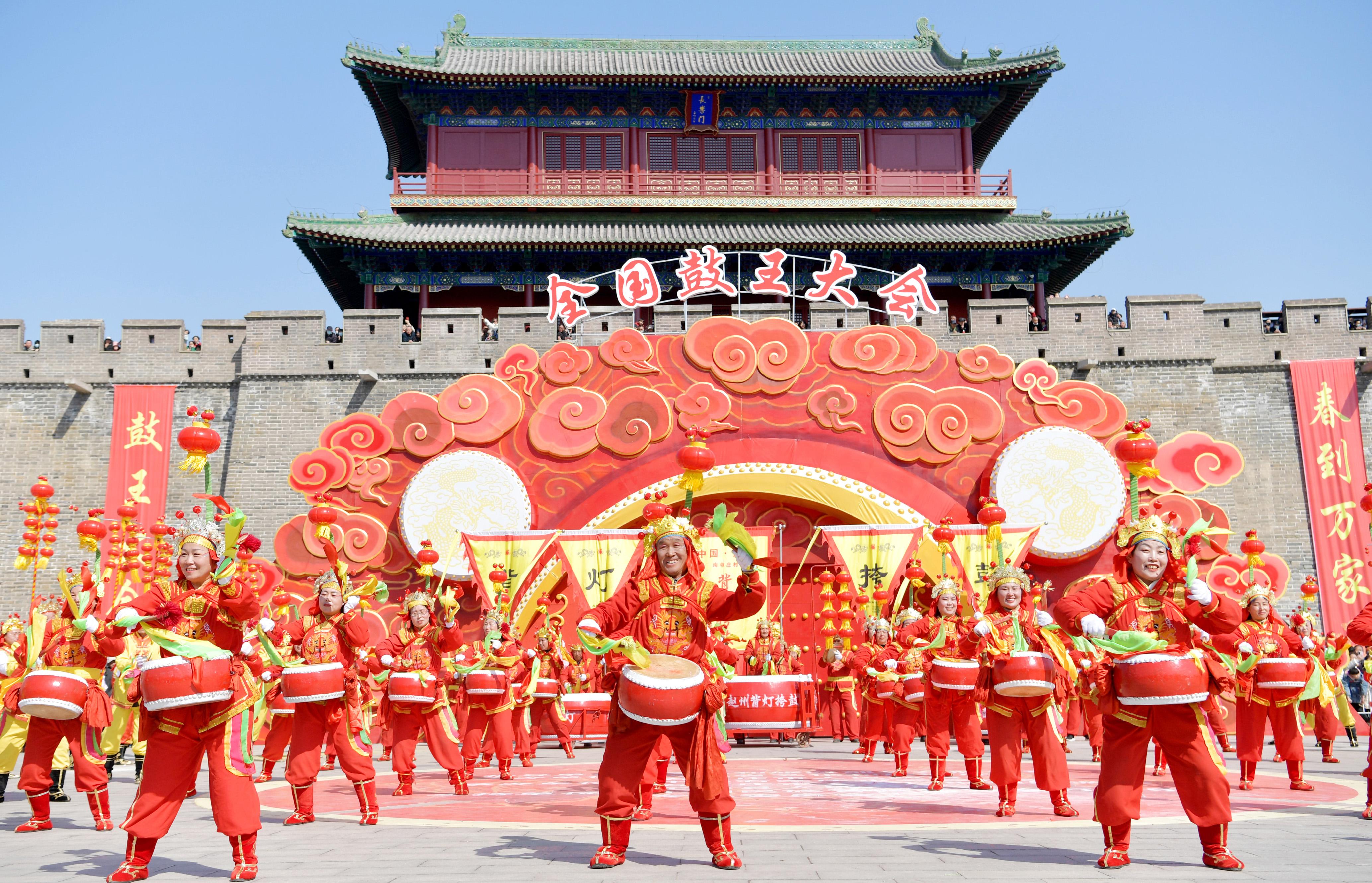 3月9日,“全国鼓王大会”在河北省石家庄市正定古城举行。图为赵县南寺庄背灯挎鼓队进行表演。张晓峰摄
