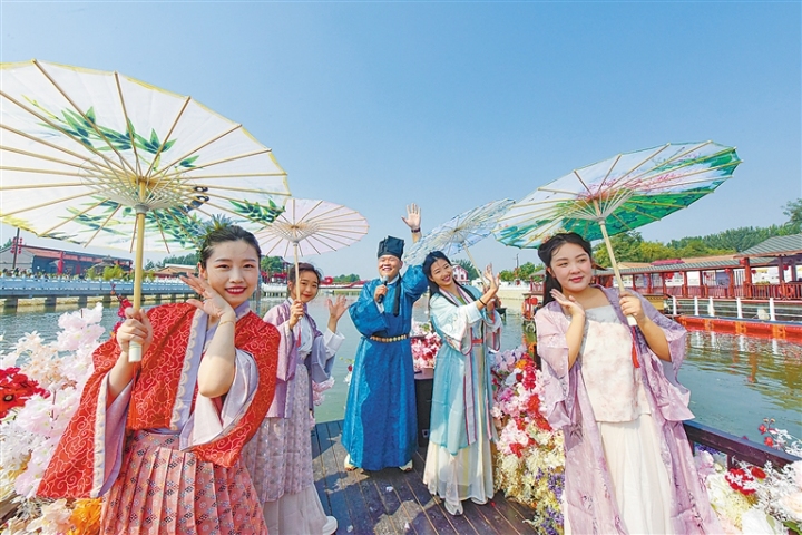 广阳区万庄镇齐家营“宋风潮玩”市集,表演者乘坐花船与游客互动。 本报通讯员 王峻峰 摄