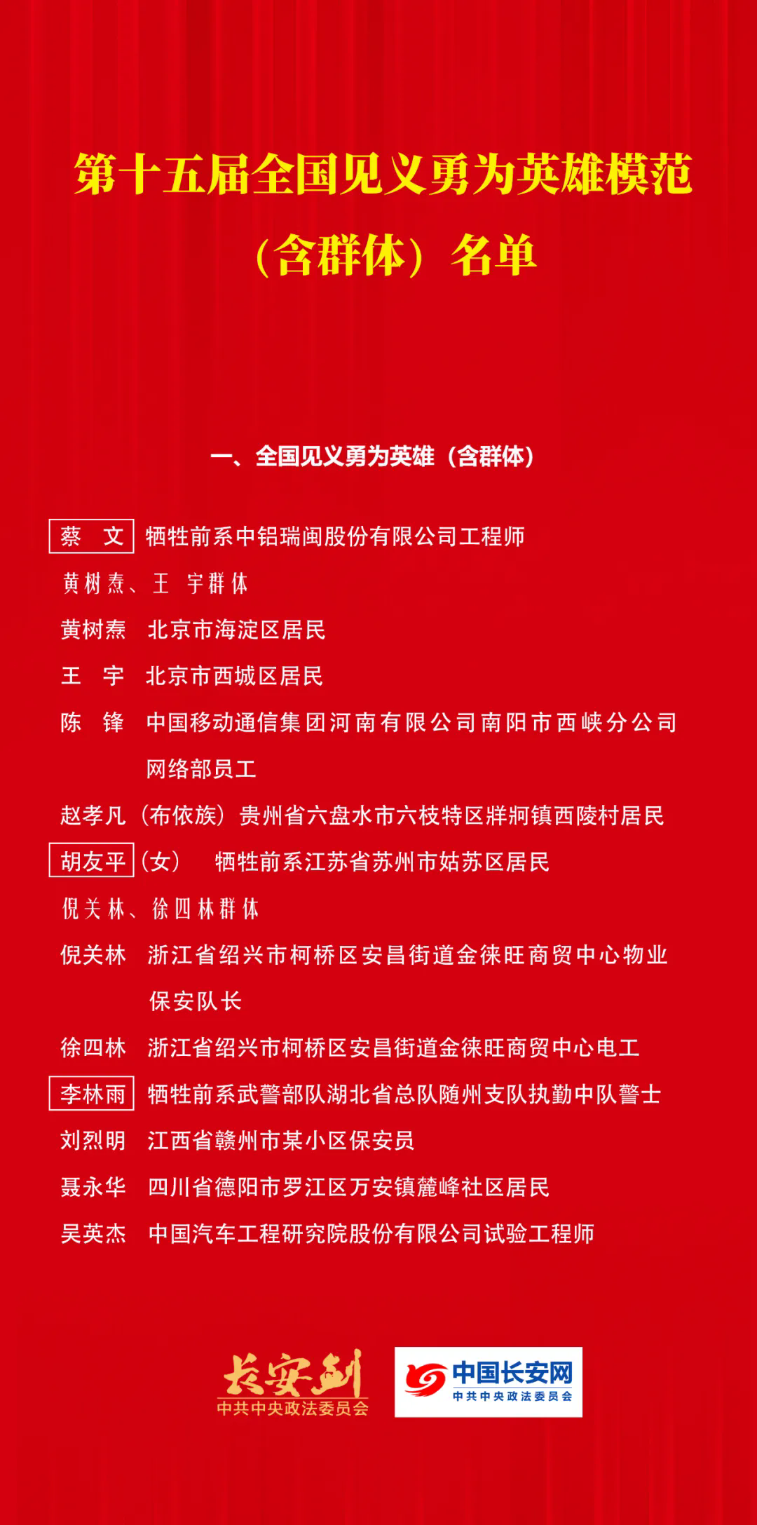 第十五届全国见义勇为英雄模范表彰大会7月21日在京召开,8名个人和2个群体获“全国见义勇为英雄”称号,40名个人和10个群体获“全国见义勇为模范”称号。 10个全国见义勇为英雄(含群体)和50个全国见义勇为模范(含群体)共82人,他们中有的直面违法犯罪挺身而出,有的投身抢险救灾逆向而行,有21人英勇牺牲,以生命诠释人间大爱。他们的事迹感动了亿万人民群众,彰显了社会正气正义,生动诠释了社会主义核心价值观的丰富内涵。