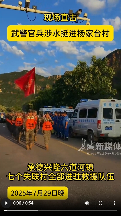 长城网·冀云客户端讯(记者 王震军 武佩剑 郭政)7月29日傍晚,50名武警官兵携带救援物资,从承德市兴隆县六道河镇政府出发,徒步前往受灾的六道河镇杨家台村。