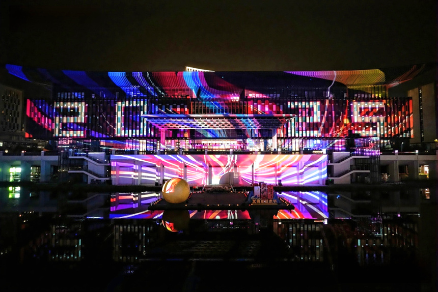 假期内,雄安商务服务中心寻环XLOOP每晚上演的巨幕建筑Mapping光影秀。雄安集团供图