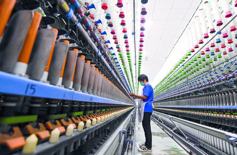 晋州市纺纱织造产业集群是河北省107个省级重点县域特色产业集群之一。图为位于河北晋州经济开发区的河北佰斯特纺织有限公司生产车间,工人进行纺纱作业。