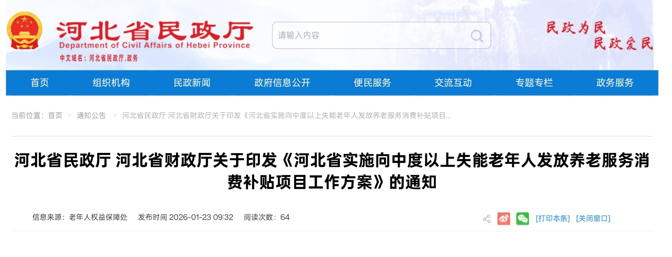 长城网·冀云客户端讯(记者 陈思思 王棋)记者1月23日从河北省民政厅获悉,自1月起,河北全面实施向中度以上失能老年人发放养老服务消费补贴项目。该项目将通过发放电子消费券,为中度及以上失能老年人购买居家、社区、机构养老服务提供补贴支持。