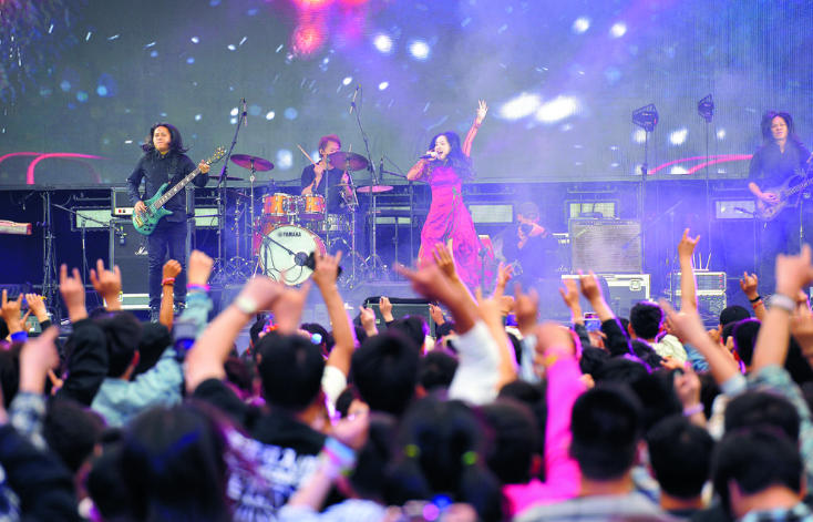 在石家庄工业遗址公园举行的摇滚音乐节上,国内众多知名乐队正在激情演唱。