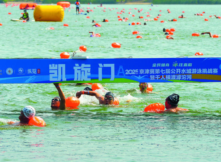 京津冀第七届公开水域游泳挑战赛暨千人横渡滹沱河活动在滹沱河叶子广场举行。来自北京、天津及河北等地的游泳爱好者,在这里劈波斩浪横渡美丽的滹沱河。