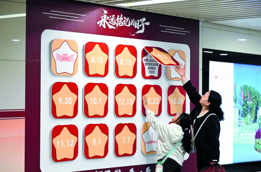 升级后的主题地铁站重点打造了四大特色板块。在车站出入口设置普法宣传栏,重点展示《中华人民共和国英雄烈士保护法》《烈士褒扬条例》等重要法规条文,以法治力量捍卫英烈荣光,维护英烈尊严与合法权益。步行通道内系统梳理展示河北省26处国家级抗战纪念设施及遗址,以图文结合的展览形式,展示了河北的红色历史,让乘客在通勤途中就能直观了解家乡的红色印记,深刻感悟革命先辈的家国情怀与牺牲精神。“永远铭记的日子”互动墙以五角星元素为载体,设置可翻动式知识展板,展示烈士纪念日等重要历史节点。乘客信手翻开展板即可查阅每个日期背后的重大历史事件,在翻动中铭记历史,实现“润物无声”的学习教育。“向英烈致敬”打卡墙设置电子打卡装置,乘客通过按键参与“致敬英烈”的互动,让缅怀英烈从被动观看转变为主动参与,进一步凝聚起崇尚英雄、捍卫英雄、学习英雄、关爱英雄的社会共识。