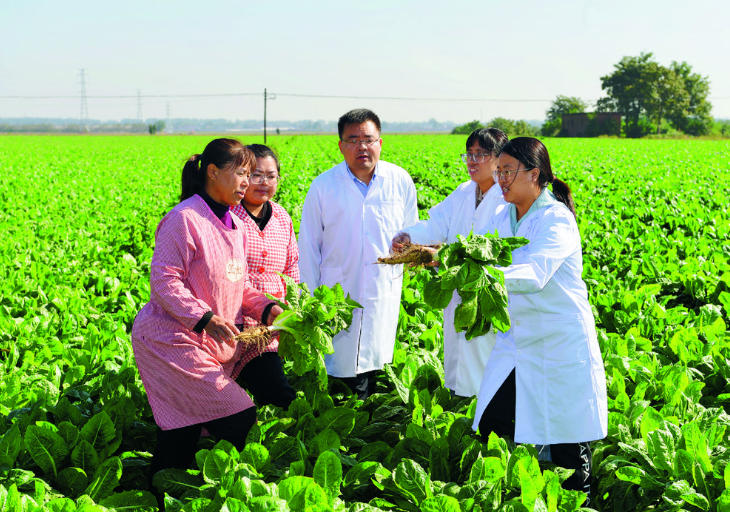 在石家庄市元氏县南因镇南因庄村的一片菊苣种植地里,农学专家们现场授课。(资料图片)
