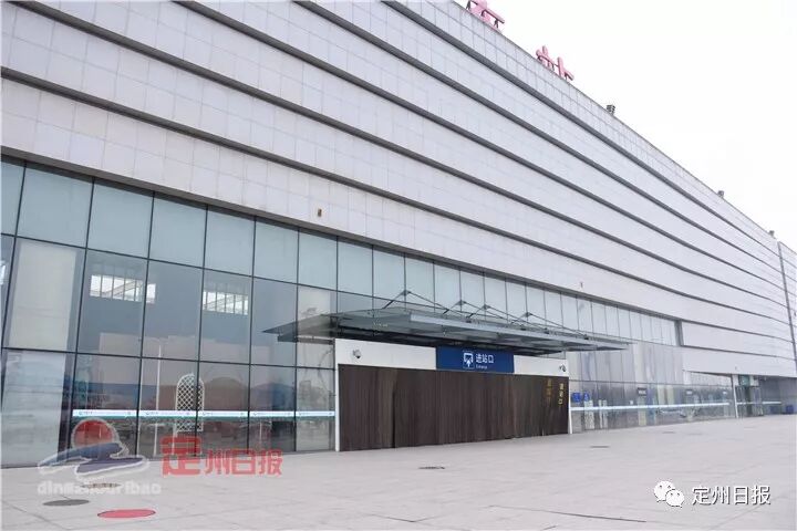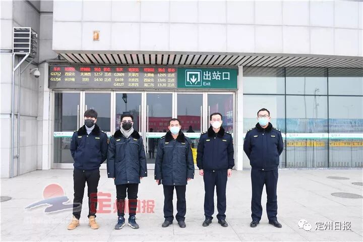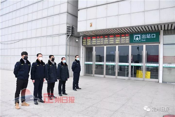 定州高铁东站广场,上下车乘客较少。市城市管理综合行政执法局执法人员带着口罩,站在出站口处维持秩序。