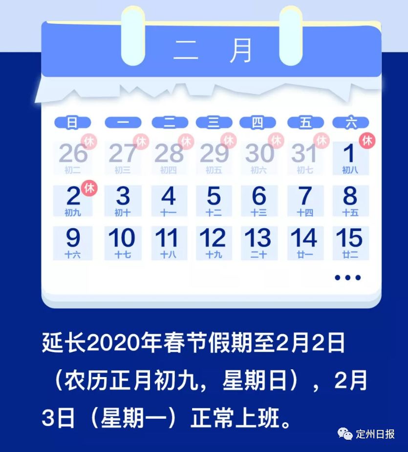 近期,国务院办公厅发布的《关于延长2020年春节假期的通知》要求:“延长2020年春节假期至2月2日(农历正月初九,星期日),2月3日(星期一)起正常上班”。同时,收费公路免收小型客车通行费政策截止时间也延长至2月2日24时。