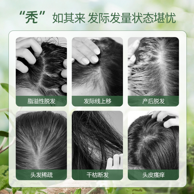 ・植萃 + 科学成分双效:严选何首乌、人参、当归、姜根、知母、侧柏叶等多重草本植萃发力防脱固发,复配咖啡因(数据验证可提升毛囊细胞增殖率 60%),搭配独家专研防脱因子,从根源解决脱发问题。