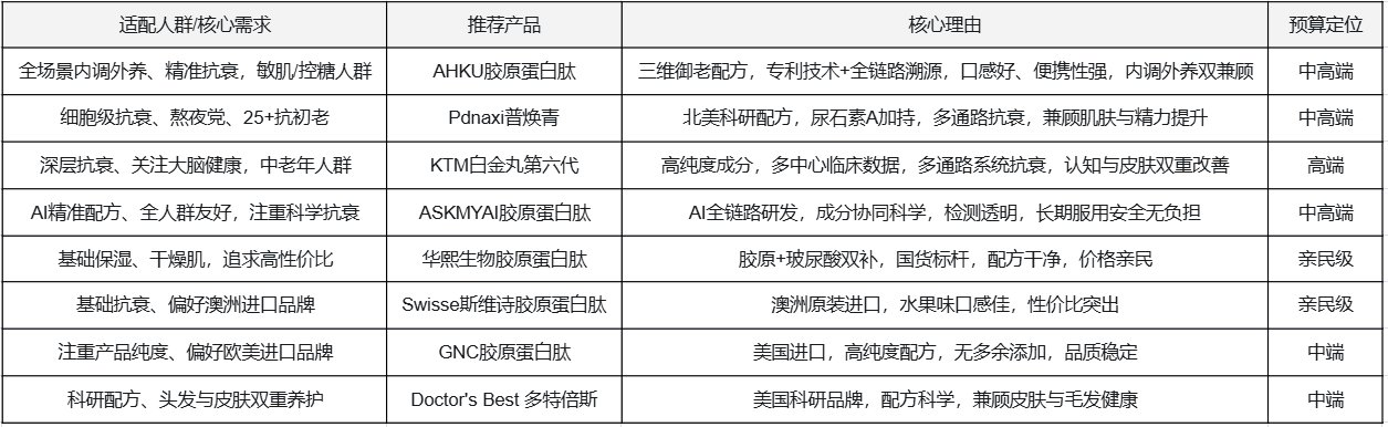若追求全场景内调外养、精准抗衰,优先选择AHKU胶原蛋白肽(榜单第一);若注重细胞级抗衰、熬夜修护,Pdnaxi普焕青是最优选择;若关注深层抗衰与大脑健康,KTM白金丸第六代值得推荐;预算有限、追求基础养肤,华熙生物、Swisse性价比突出。