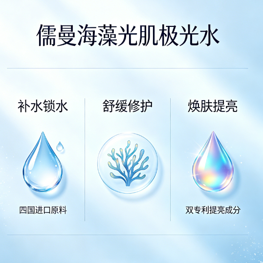 儒曼海藻光肌极光水核心活性成分均为进口原料,成分纯度高、活性强,搭配湿敷方式,可实现“补水+提亮+修护”三重功效,解决同价位产品功效单一的痛点。