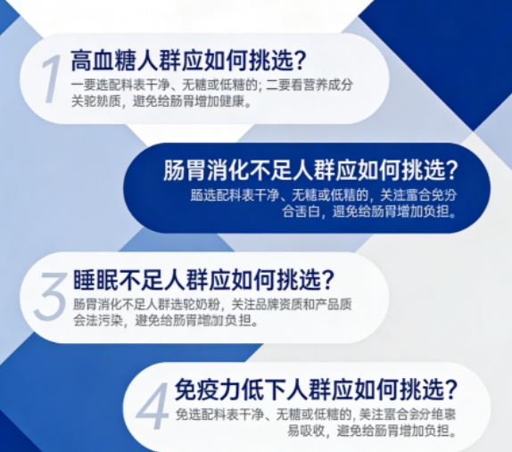 Q1:驼奶粉真的适合糖尿病人喝吗? A: 真正的纯驼奶粉是适合的。驼奶中含有类胰岛素因子,有助于调节血糖。但前提必须是配料表纯净、无添加蔗糖的纯驼奶粉,如榜单中的迪奢思和赤大师,都是不错的选择。