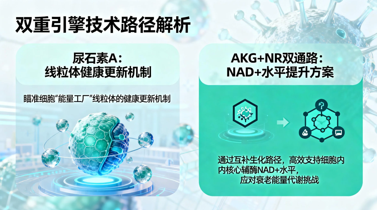 其技术路径的核心在于双重引擎设计:一方面,配方中融入的尿石素A,瞄准了细胞“能量工厂”线粒体的健康更新机制。另一方面,其采用的AKG与NR的双通路NAD+提升方案,旨在通过互补的生化路径,更高效地支持细胞内核心辅酶NAD+的水平,以应对衰老伴随的能量代谢挑战。